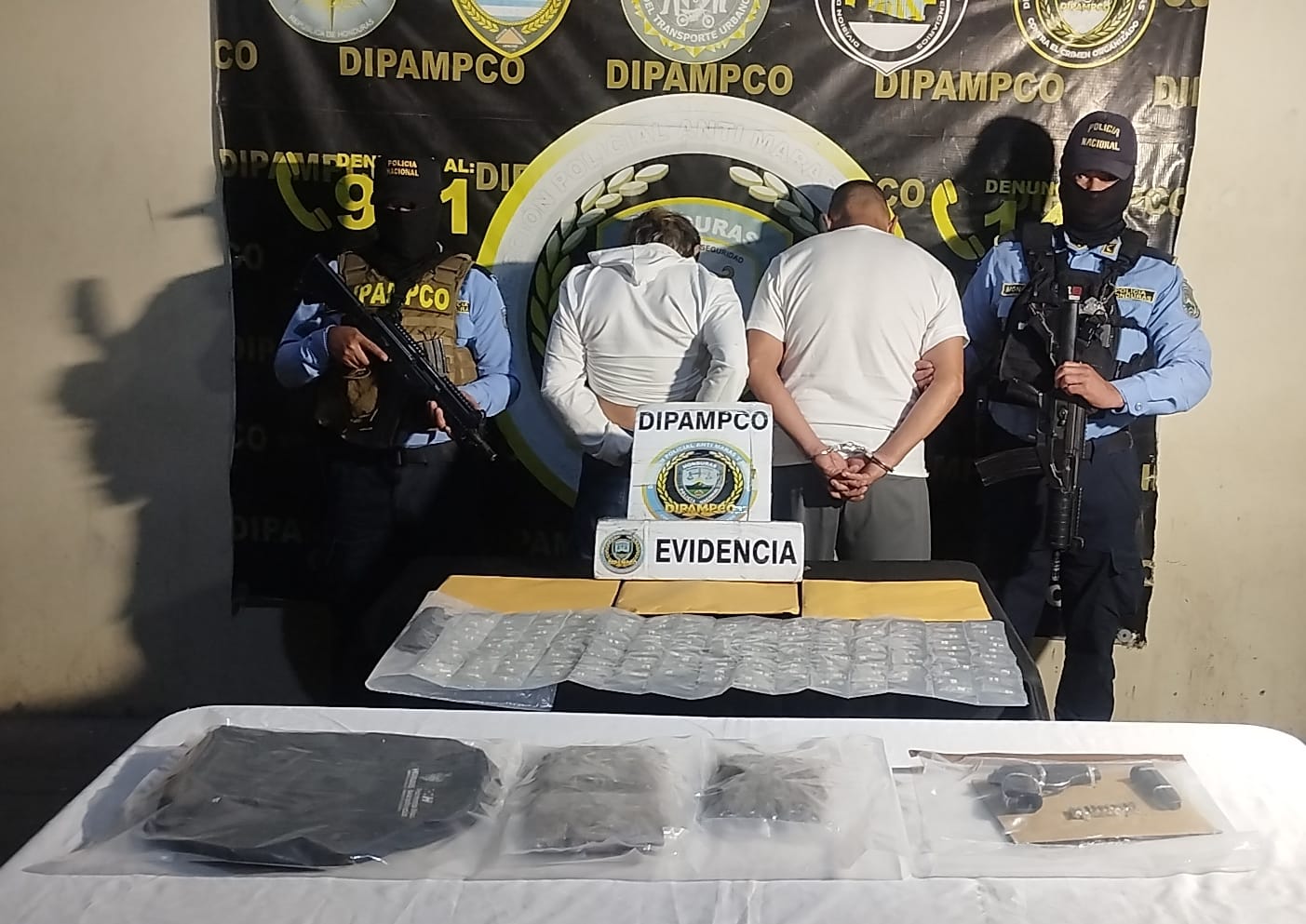 Producto de estas acciones, y mediante trabajos de vigilancia, seguimiento e inteligencia desarrollados por equipos especiales de la DIPAMPCO en coordinación con la Unidad Metropolitana de Policía N.° 4, en las últimas horas se logró la captura de dos individuos en la aldea Cruz del Arco, municipio de Tatumbla, al oriente del Distrito Central.
