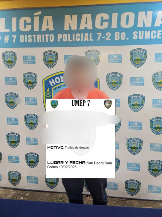 San Pedro Sula, Cortés, 11 de febrero de 2026. En el marco del Plan “Comunidades Seguras”, agentes de la Unidad Metropolitana de Prevención Número 7 (UMEP-7), mediante operación policial, dieron detención a una persona del sexo masculino en el barrio Cabañas, por suponerlo responsable del delito de tráfico de drogas.