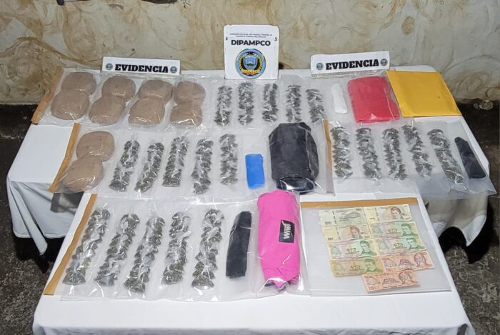 Al momento de la aprehensión se decomisaron 200 bolsitas plásticas con supuesta marihuana, 10 paquetes envueltos con cinta adhesiva de color café con el mismo tipo de estupefaciente, un teléfono celular y dinero en efectivo proveniente del ilícito.