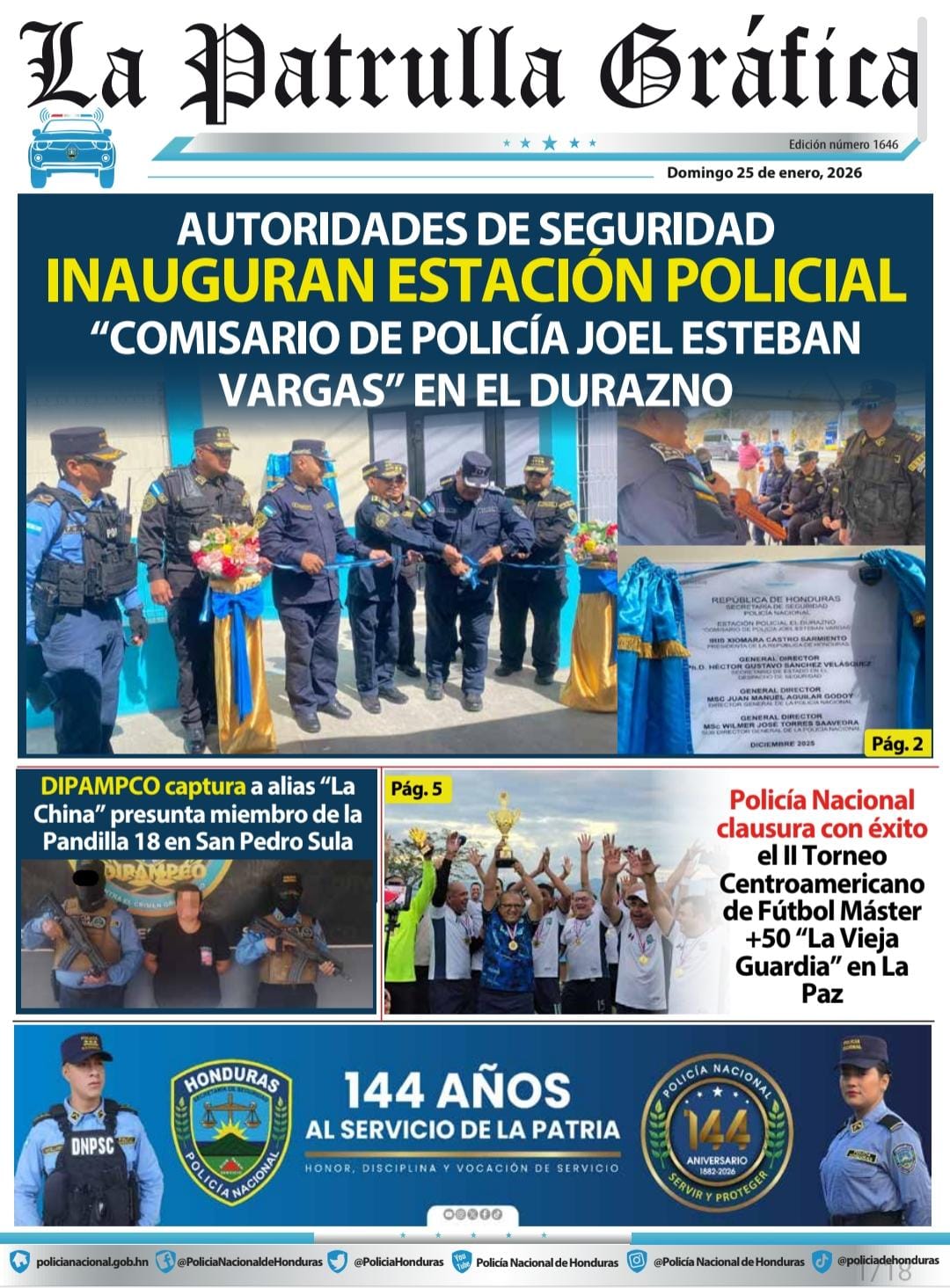 Redes Sociales Ene, Dom, 2026 LA PATRULLA GRAFICA AUTORIDADES DE SEGURIDAD INAUGURAN ESTACIÓN POLICIAL “COMISARIO DE POLICÍA JOEL ESTEBAN VARGAS” EN EL DURAZNO DOMINGO 25 DE ENERO 2026 – LA PATRULLA GRAFICADescarga Comentarios 0