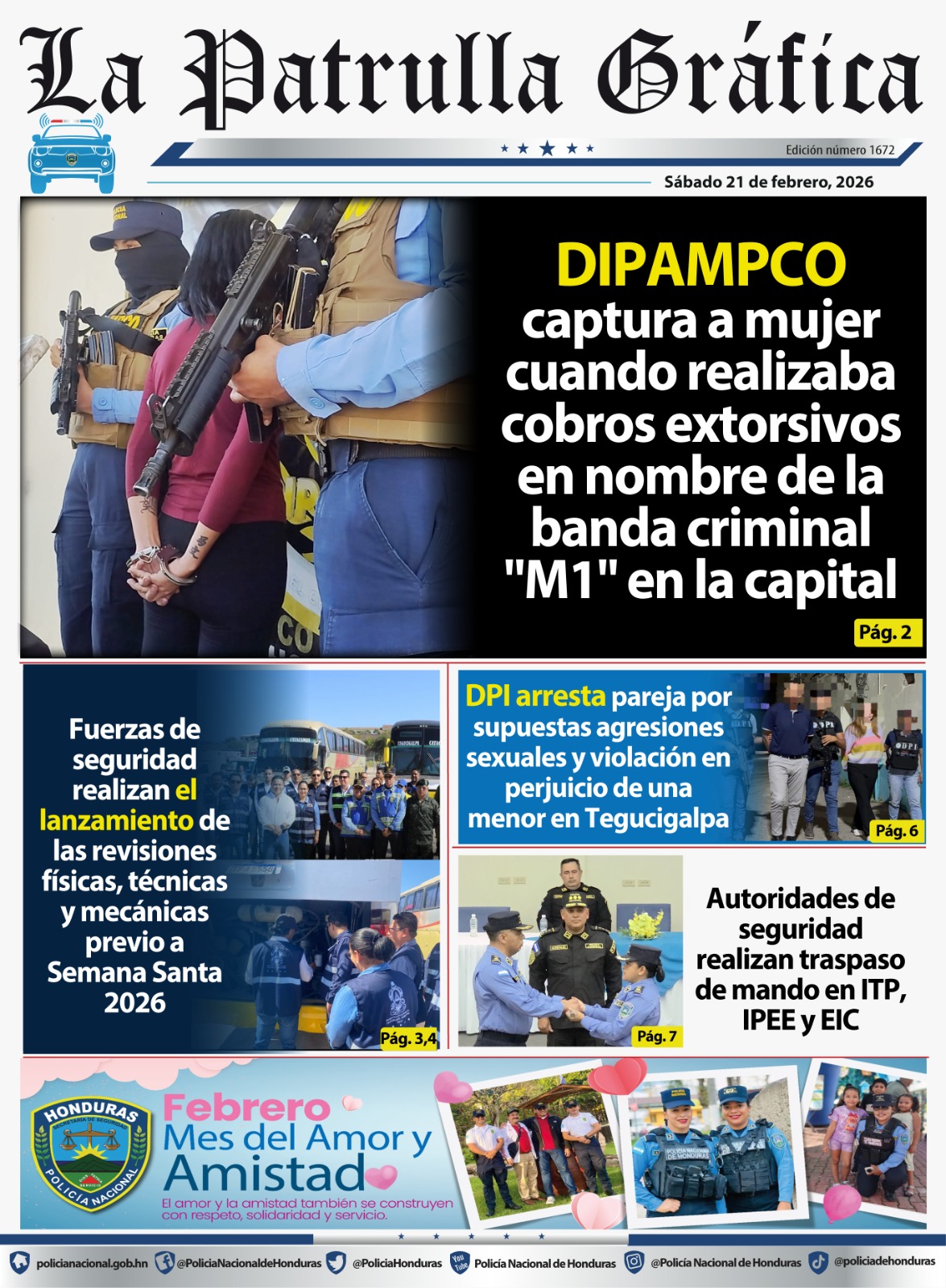 Redes Sociales Feb, Sáb, 2026 LA PATRULLA GRAFICA DIPAMPCO captura a una mujer cuando realizaba cobros extorsivos en nombre de la banda criminal “M1” en la capital SÁBADO 21 DE FEBRERO 2026 – LA PATRULLA GRAFICA – copiaDescarga
