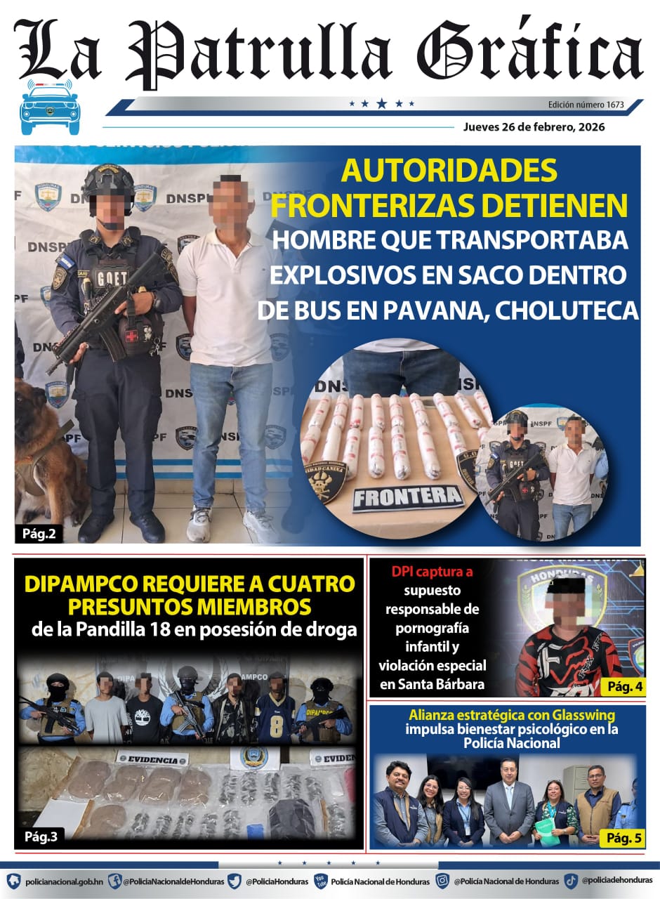 Redes Sociales Feb, Jue, 2026 LA PATRULLA GRAFICA Autoridades fronterizas detienen a hombre que transportaba explosivos en saco dentro de bus en Pavana, Choluteca JUEVES 26 DE FEBRERO 2026 – LA PATRULLA GRAFICADescarga