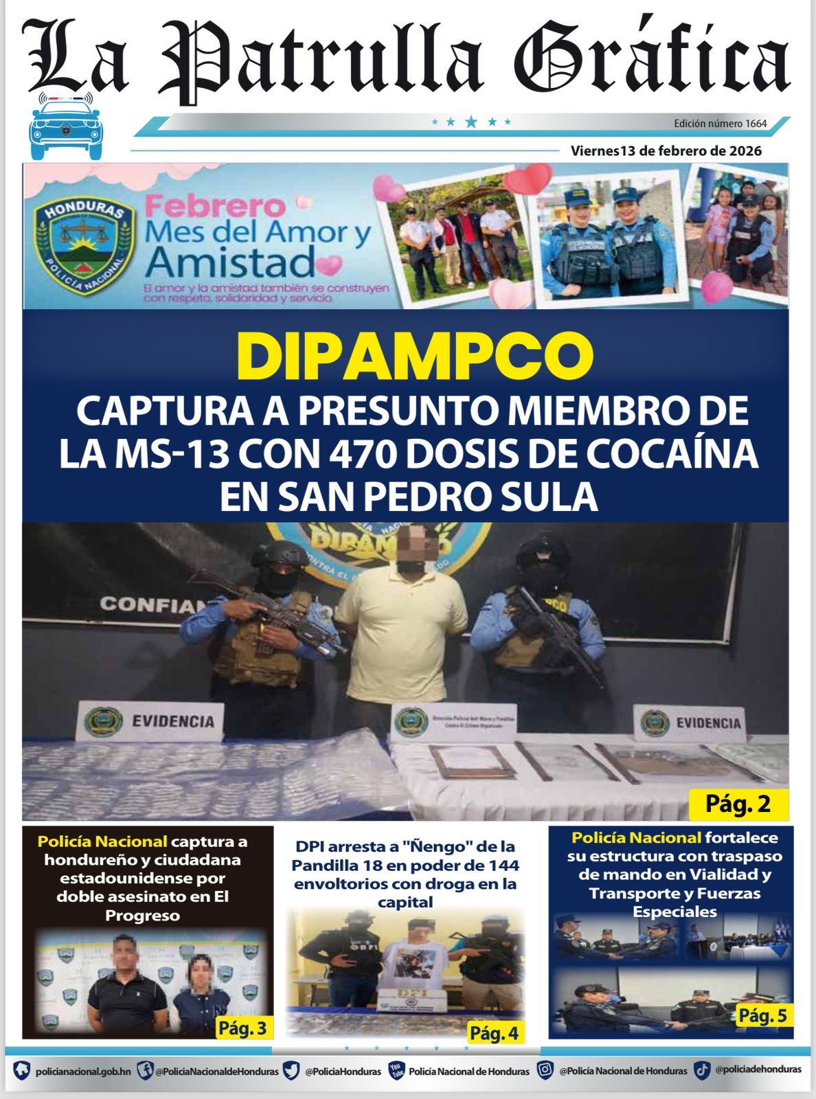 Redes Sociales Feb, Vie, 2026 LA PATRULLA GRAFICA Captura a presunto miembro de la ms-13 con 470 dosis de cocaína en San Pedro Sula VIERNES 13 DE FEBRERO DE 2026 – LA PATRULLA GRAFICA copia (1)Descarga