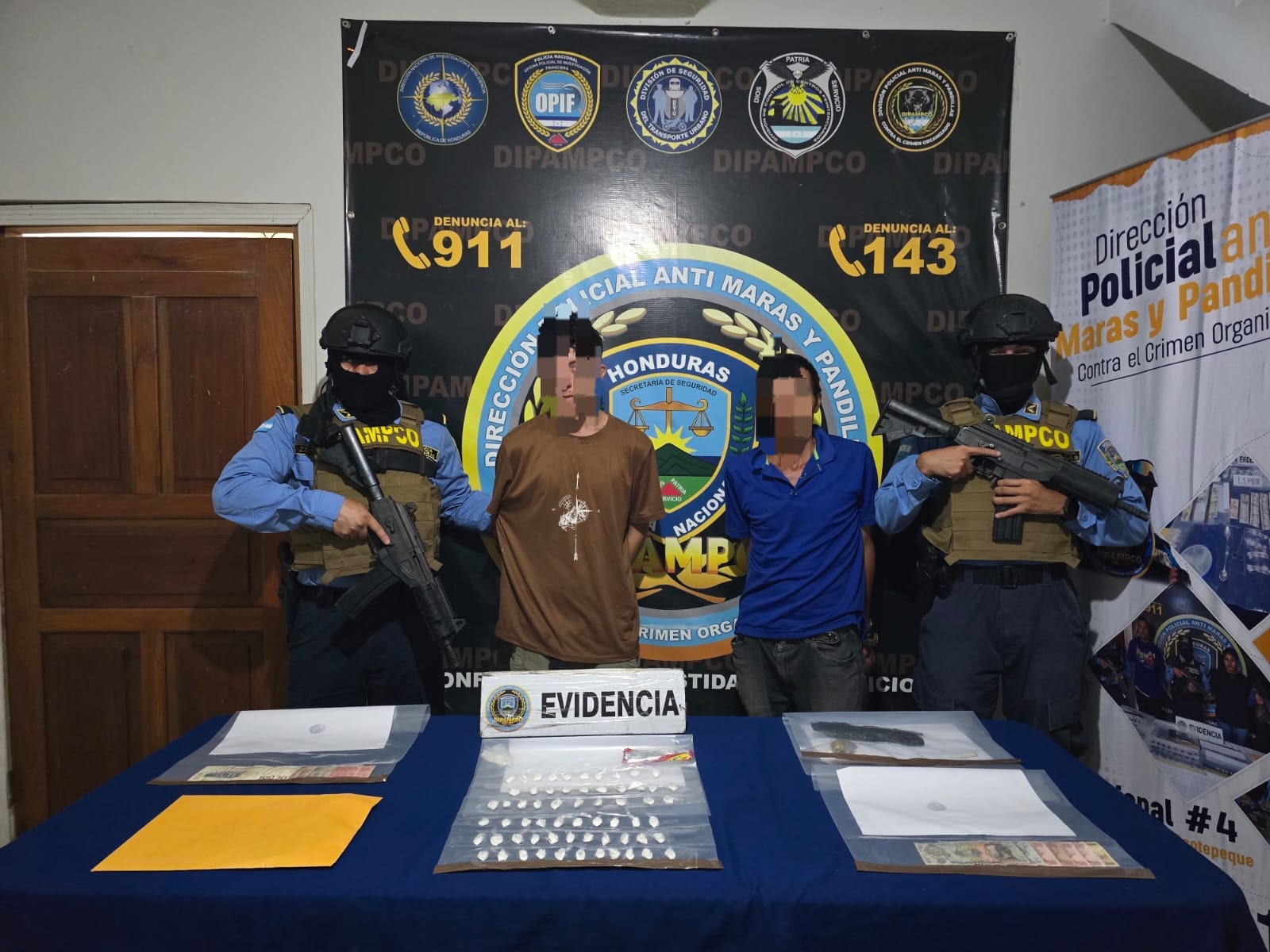 Lepaera, Lempira. 8 de diciembre de 2025. Agentes de la Dirección Policial Anti Maras y Pandillas Contra el Crimen Organizado (DIPAMPCO), en coordinación con la Dirección Nacional de Prevención y Seguridad Comunitaria (DNPSC), mediante una saturación policial en la aldea Las Crucitas de Lepaera, Lempira, detuvieron a dos personas por suponerlos responsables del delito de tráfico de drogas.