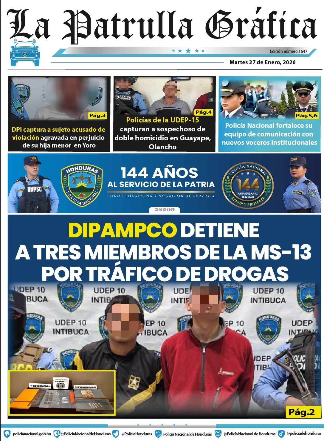 Redes Sociales Ene, Mar, 2026 LA PATRULLA GRAFICA DIPAMPCO DETIENEA TRES MIEMBROS DE LA MS-13 POR TRÁFICO DE DROGAS MARTES 27 DE ENERO 2026 – LA PATRULLA GRAFICA copiaDescarga Comentarios 0