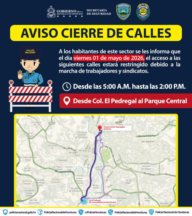 Tegucigalpa, M.D.C., 29 de abril de 2026.– La Dirección Nacional de Vialidad y Transporte (DNVT) informa a la ciudadanía en general sobre las acciones de control y regulación vehicular que se implementarán en la capital, en el marco de las movilizaciones por el Día Internacional del Trabajador.