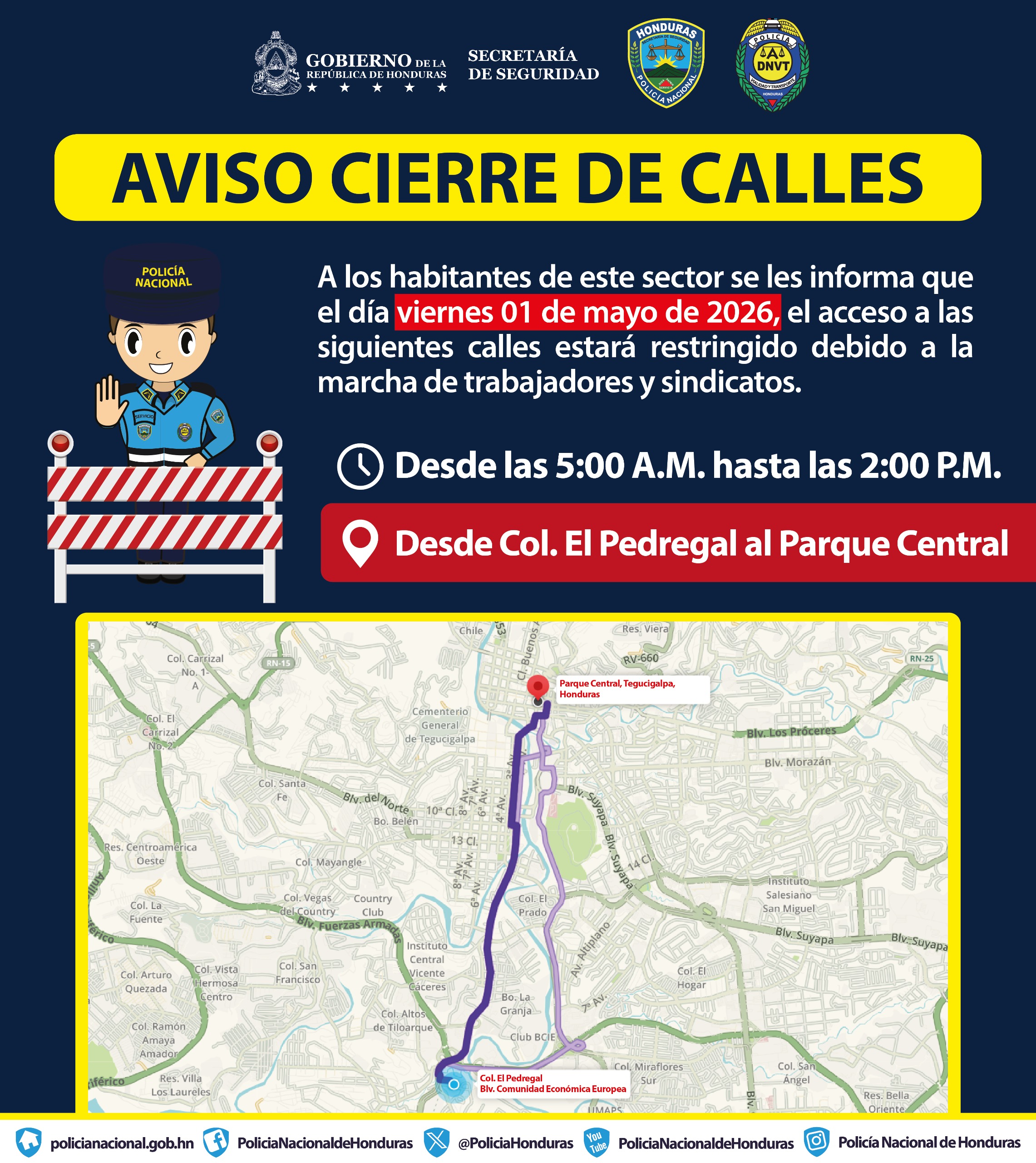 Como parte del dispositivo vial, se mantendrá cerrado el tramo comprendido desde la entrada a la colonia El Pedregal hasta el Parque Central de Tegucigalpa, ruta principal donde se desarrollarán las actividades conmemorativas.