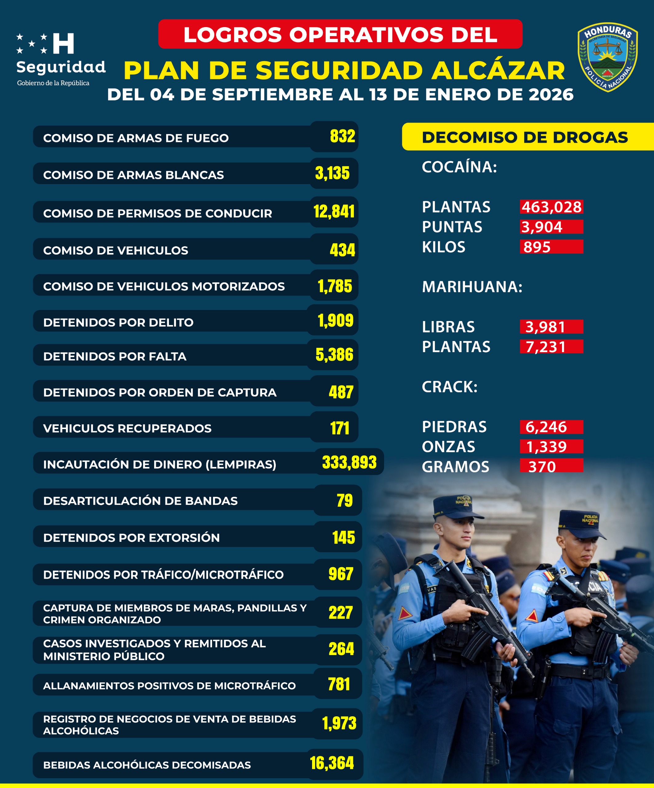 La Policía Nacional de Honduras continúa fortaleciendo su capacidad operativa y preventiva mediante la ejecución sostenida del Plan de Seguridad Alcázar, desarrollado en los municipios de mayor incidencia delictiva del país, obteniendo resultados significativos en la lucha contra la criminalidad y el crimen organizado.