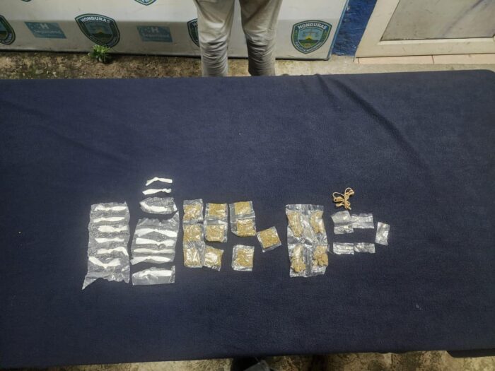 Durante una inspección personal, se le encontró 14 envoltorios con polvo blanco (supuesta cocaína), 14 envoltorios con hierba seca (supuesta marihuana) y 6 envoltorios más con una piedra blanca (supuesto crack).