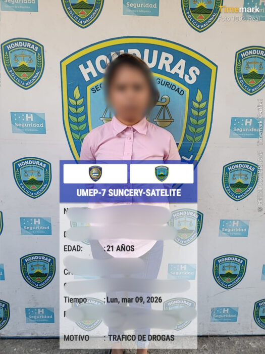 San Pedro Sula, Cortés, 10 de marzo de 2026. La Policía Nacional, a través de la Unidad Metropolitana de Prevención N.º 7 (UMEP-7), en coordinación con la Unidad Policial Motorizada (UPOM), le dio detención en la colonia Sandoval a una ciudadana por suponerla responsable del delito de tráfico de drogas en perjuicio de la salud pública del Estado de Honduras.
