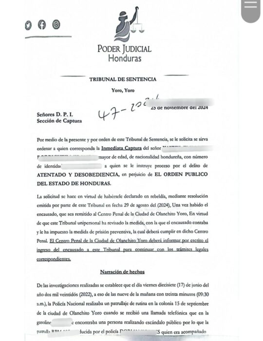 La orden de captura había sido girada el 25 de noviembre de 2024 por el Tribunal de Sentencia de Yoro, luego de comprobarse su responsabilidad en hechos que atentaron contra el orden público y la autoridad policial.