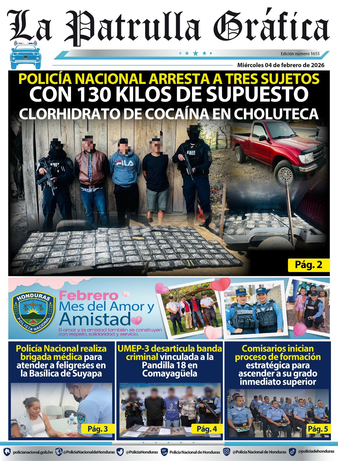 Redes Sociales Feb, Mié, 2026 LA PATRULLA GRAFICA POLICÍA NACIONAL ARRESTA A TRES SUJETOS CON 130 KILOS DE SUPUESTO CLORHIDRATO DE COCAÍNA EN CHOLUTECA MIÉRCOLES 04 DE FEBRERO DE 2026 – LA PATRULLA GRAFICA (1)Descarga Comentarios 0