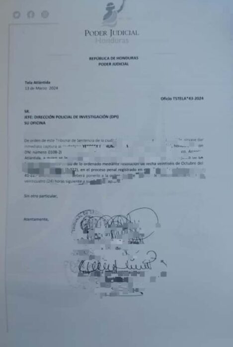 - Emitida por el Tribunal de Sentencia de Tela, en fecha,13 de marzo del año 2024.