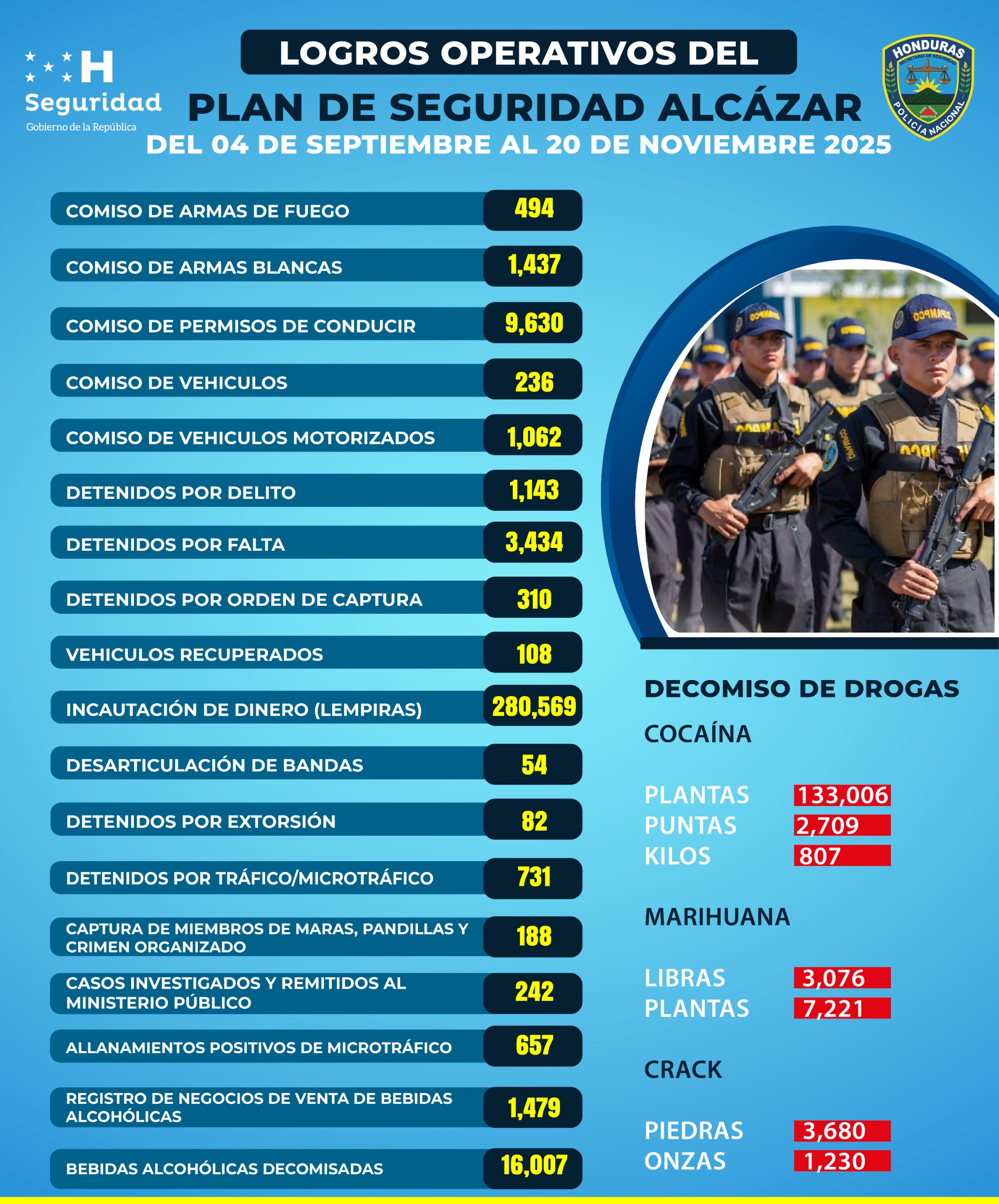 Tegucigalpa 21 de noviembre 2025.- La Policía Nacional presentó un consolidado de resultados operativos que demuestra el impacto directo del Plan Alcázar en los municipios de mayor incidencia del país, con acciones ejecutadas por las UDEP 01, 02, 15, 18, 04, 07, 08 y UMEP 02 en coordinación con unidades especiales y de investigación. Este esfuerzo conjunto muestra avances significativos en la reducción del delito, el combate al crimen organizado y la prevención estratégica.