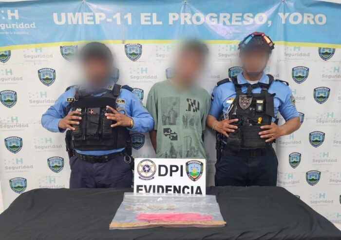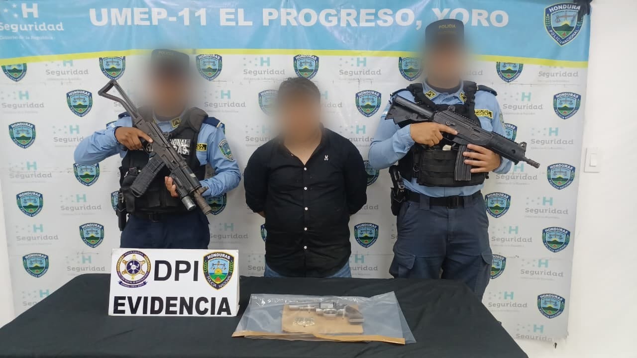 El segundo detenido es un hombre de 35 años, conocido como “Cristhian,” originario y residente en aldea La Guacamaya, sector sur de El Progreso, Yoro, quien fue detenido infraganti por suponerlo responsable del delito de porte ilegal de arma de fuego de uso permitido en perjuicio del orden público del Estado de Honduras.