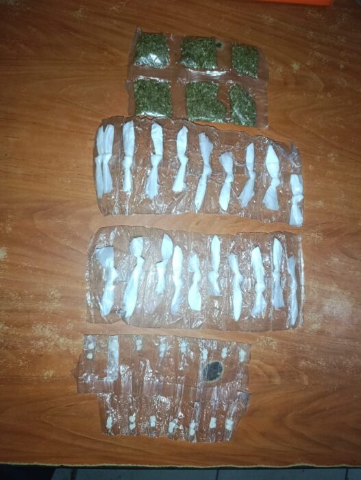 Como evidencia se le decomisaron 20 envoltorios plásticos en forma de punta conteniendo polvo blanco, supuesta cocaína; seis envoltorios plásticos con sustancia sólida blanca, supuesto crack; y 15 envoltorios con hierba seca, supuesta marihuana.