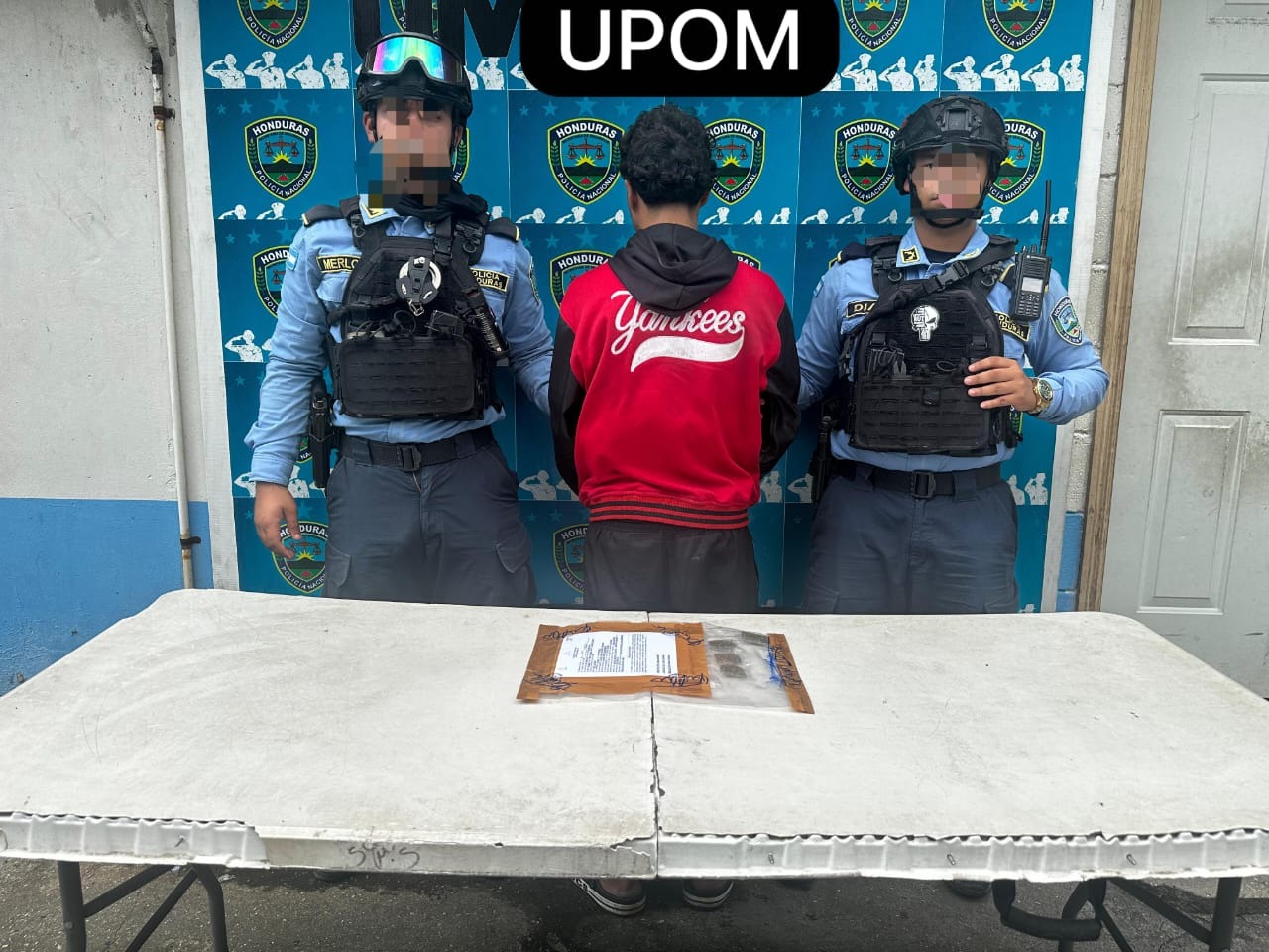 San Pedro Sula, Cortes. 14 de noviembre del 2025.- La Unidad Policial Motorizada del Valle de Sula (UPOM), ejecutó una contundente acción operativa que dejó como resultado la aprehensión de un menor infractor conocido con el alias “Bonais”, presunto miembro activo de la MS-13 a quien se le supone responsable de la infracción penal de tráfico de drogas.