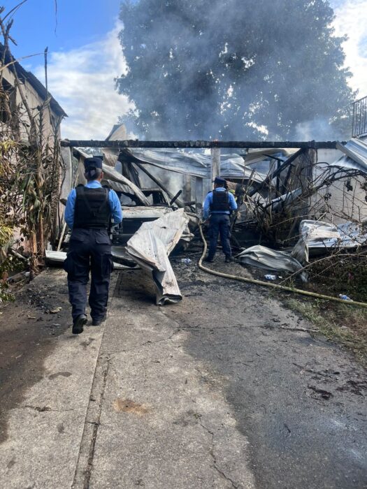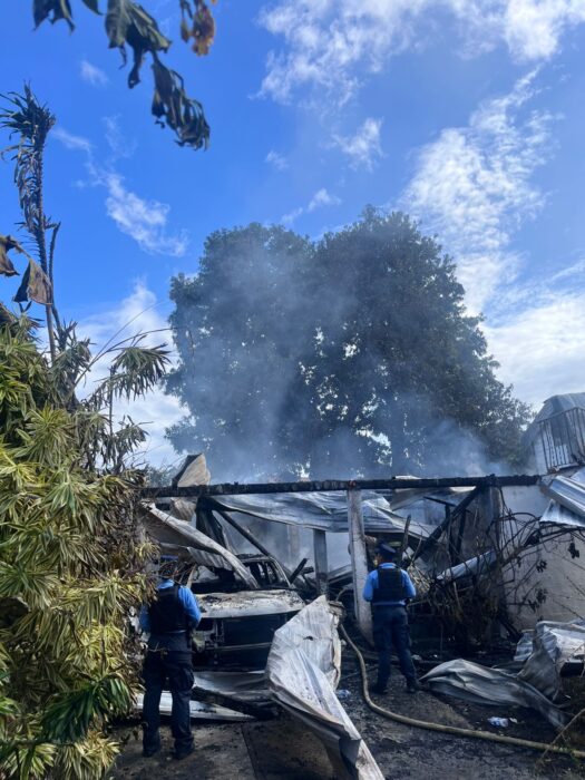 La Ceiba, Atlántida. 21 de diciembre de 2025. La Policía Nacional, a través de funcionarios asignados a la Unidad Departamental de Prevención número uno (UDEP-1), brindó apoyo y acompañamiento al Cuerpo de Bomberos en la atención de un incendio registrado en una vivienda ubicada en el barrio Mejía del municipio de La Ceiba, Atlántida.